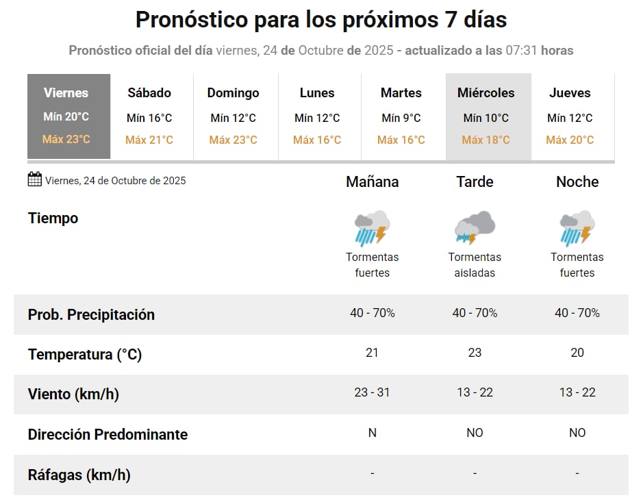 Según el Servicio Meteorológico Nacional (SMN), luego de las tormentas previstas para hoy y mañana, el tiempo se estabilizará en el AMBA de cara a los comicios. Aunque la temperatura no alcanzará valores típicos de primavera, se espera una jornada templada, con una máxima de 23 °C y una mínima de 12 °C.
