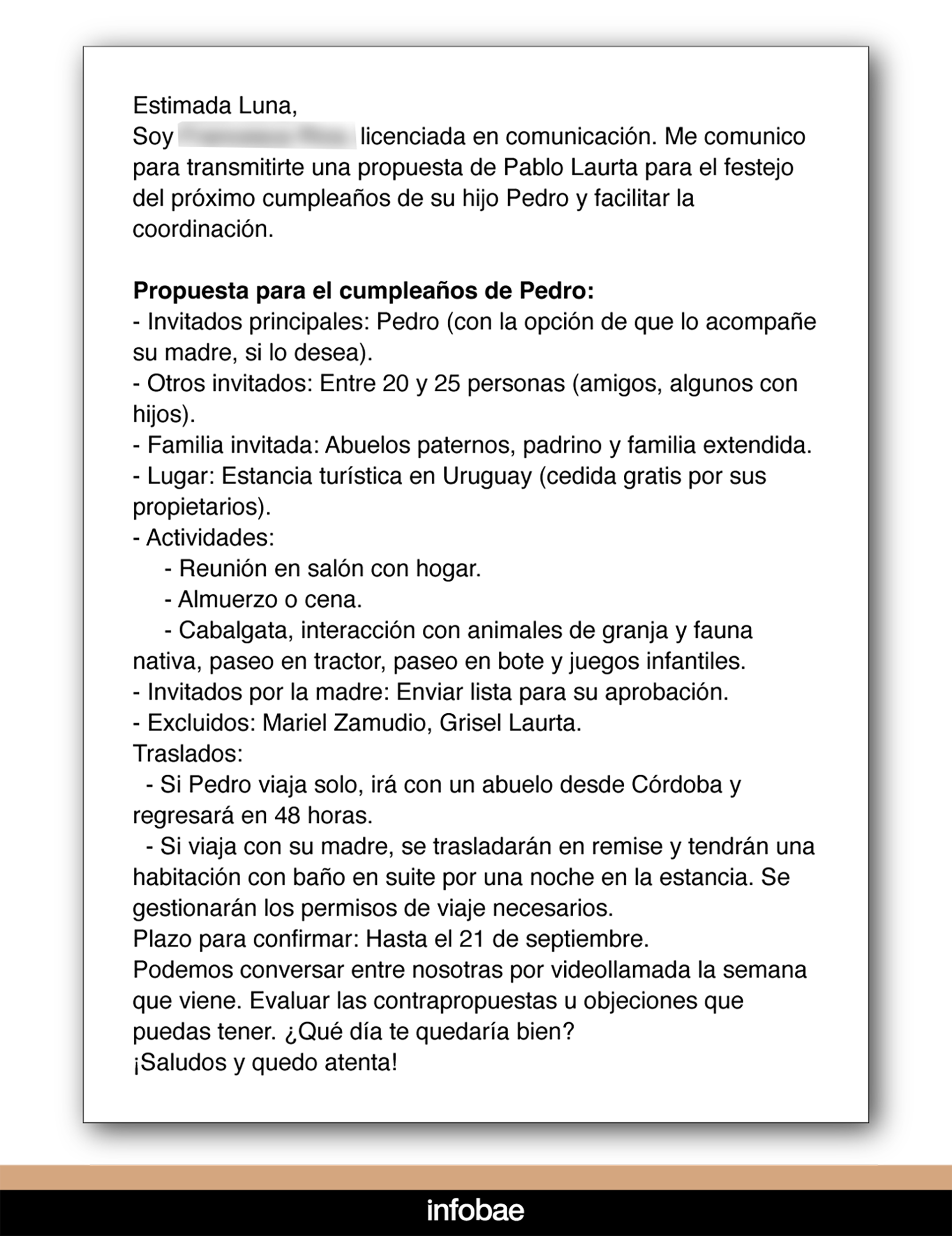 Ese mensaje de la licenciada en comunicación decía lo siguiente: “Me comunico para transmitirte una propuesta de Pablo Laurta para el festejo del próximo cumpleaños de su hijo Pedro y facilitar la coordinación”.
