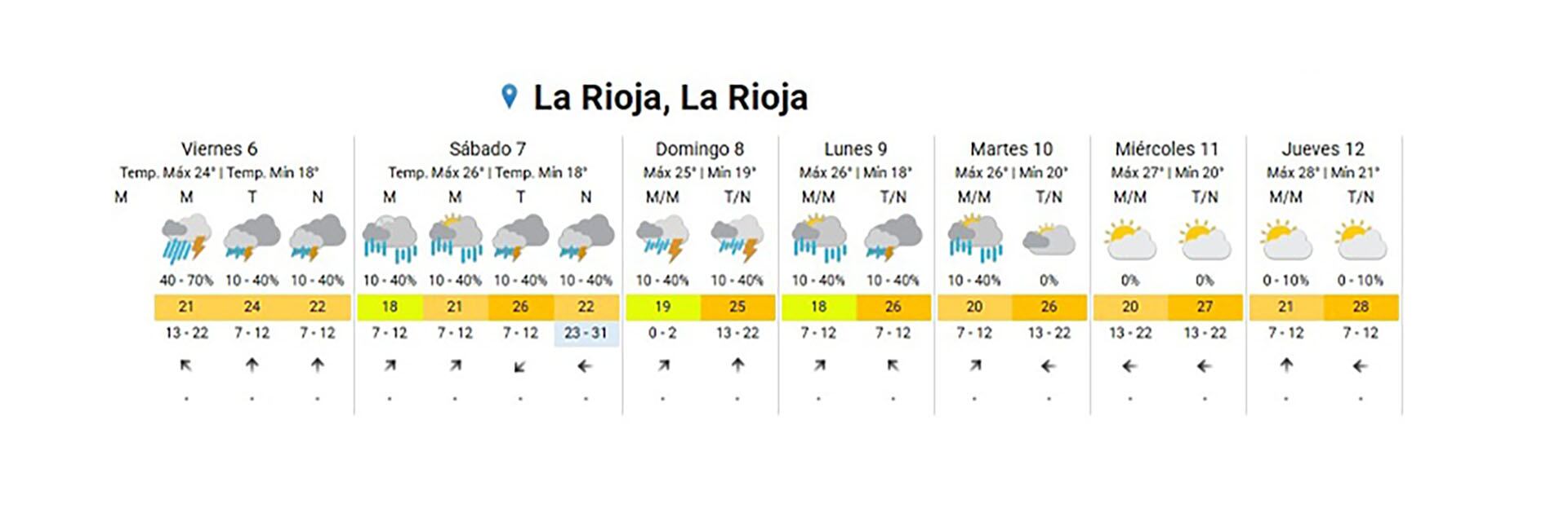 El pronóstico del tiempo para los próximos siete días en La Rioja, capital, con probabilidades de precipitación (SMN )