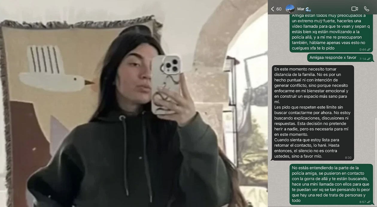 La familia de la joven comenzó a preocuparse cuando dejó de tener contacto con ellos. Incluso, bloqueó a sus allegados en sus redes sociales. Luego, algunos amigos comenzaron a recibir, como respuesta a ese comportamiento, mensajes que los inquietaron más. En ese lapso de tiempo, si bien envió fotos, nunca compartió su ubicación.