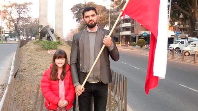 Francisco Condorí y su hija posan con la bandera de Polonia en las calles de San Miguel de Tucumán, de donde son oriundos