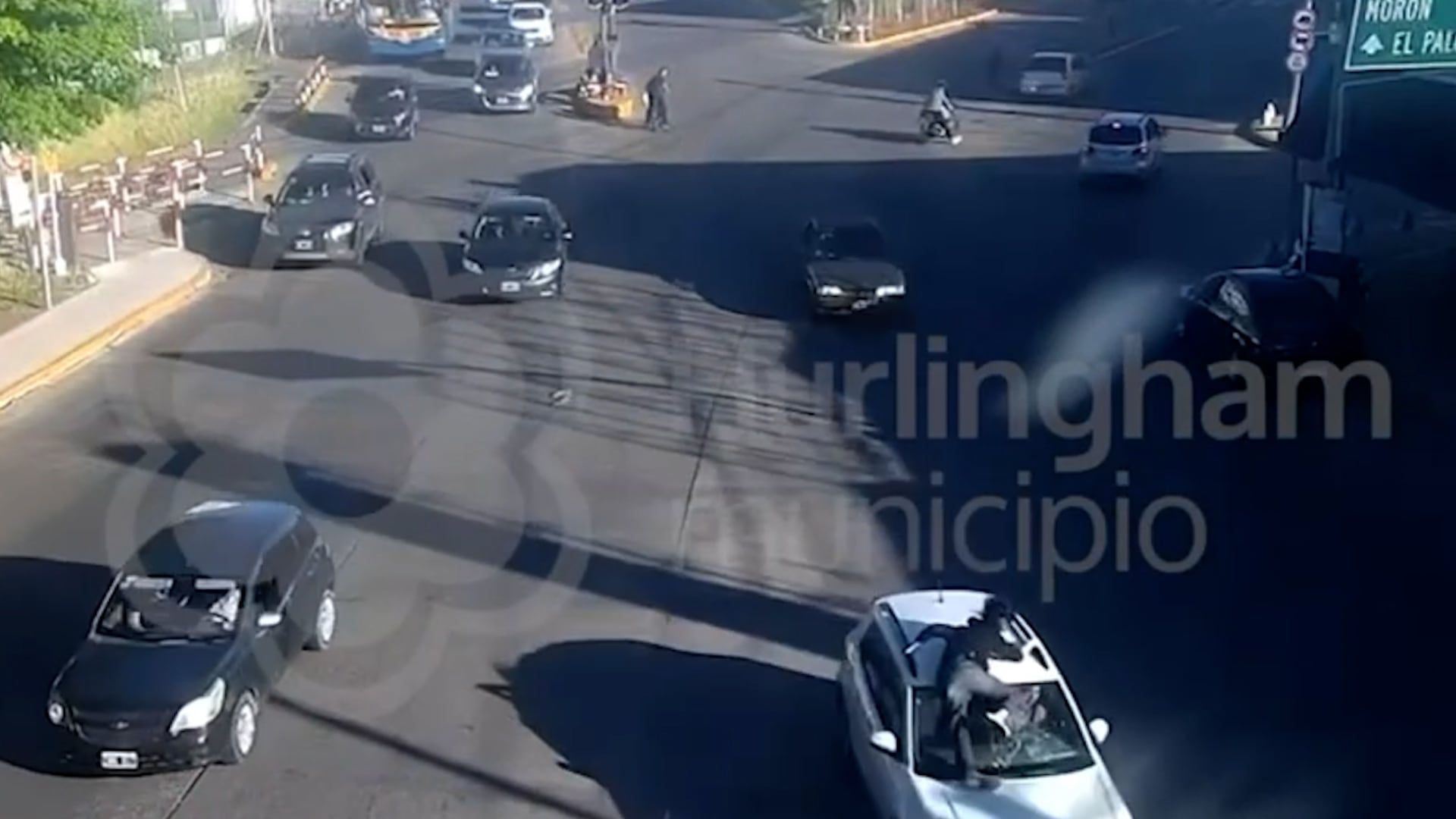 En las imágenes capturadas por el Centro de Monitoreo del Municipio de Hurlingham, que acompañan esta nota, se puede ver cómo el hombre iba agarrado al vehículo, con su cuerpo sobre el capot. Incluso en una de las tomas se alcanza a apreciar cómo patea el parabrisas para evitar que la mujer siga avanzando.