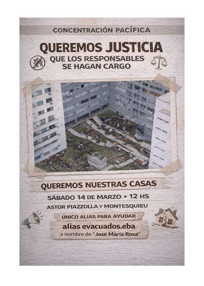 La manifestación se realizará este sábado 14 de marzo desde las 12 del mediodía en la esquina de Astor Piazzola y Montesquieu. “Queremos nuestras casas”, reza el flyer que hicieron circular entre los habitantes del edificio, que el pasado martes 3 de marzo sufrió el coalpso de una losa sobre un estacionamiento subterráneo y provocó a evacuación total del lugar. La convocatoria también aporta un alias, a través del cual piden colaboración económica: evacuados.eba a nombre de José María Rosa.