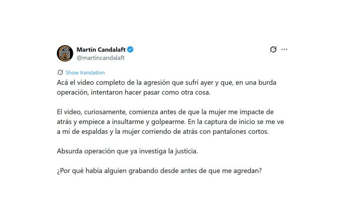 “Acá el video completo de la agresión que sufrí ayer y que, en una burda operación, intentaron hacer pasar como otra cosa. El video, curiosamente, comienza antes de que la mujer me impacte de atrás y empiece a insultarme y golpearme. En la captura de inicio se me ve a mí de espaldas y la mujer corriendo de atrás con pantalones cortos. Absurda operación que ya investiga la justicia. ¿Por qué había alguien grabando desde antes de que me agredan?“, escribió Candalaft.
