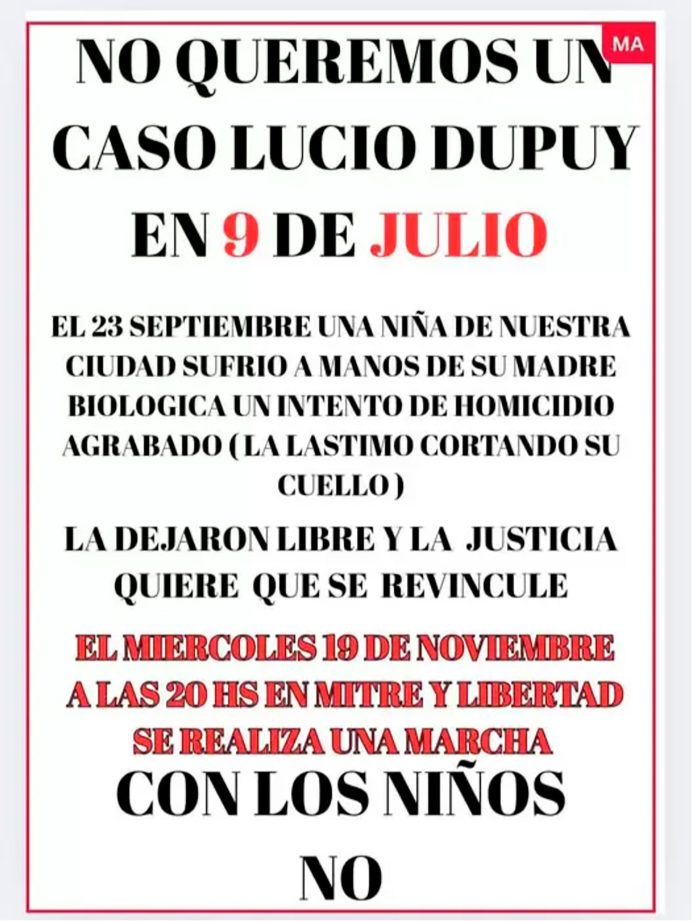 El crimen de Lucio Dupuy fue lo primero que apareció en la cabeza de un papá desesperado de la localidad bonaerense de 9 de Julio que salió a pedir ayuda: su ex pareja intentó degollar a su hija de 6 años y, tras ser declarada inimputable en base a pericias psiquiátricas, el hombre teme por la vida de la nena, busca la tenencia y alejarla de su madre.