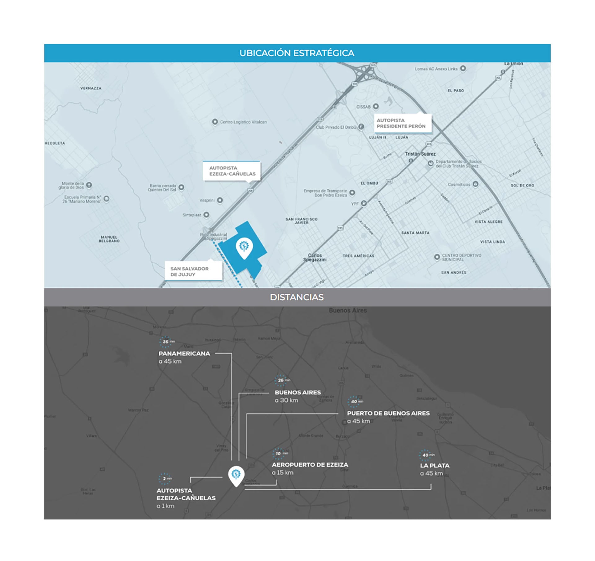 La conectividad es uno de los principales activos del polo. Su proximidad a la Ruta Provincial 205 y al Aeropuerto Internacional de Ezeiza, ubicado a solo 12 kilómetros, facilita las operaciones logísticas y de comercio exterior para las empresas instaladas.