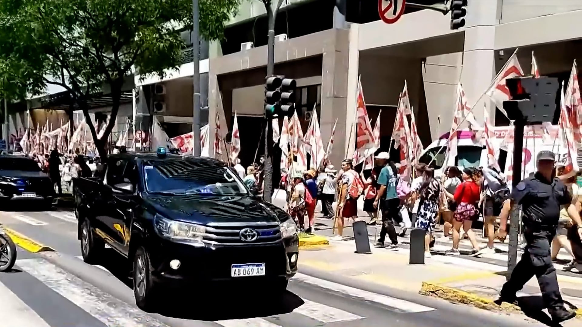 La presencia de la comitiva oficial, identificada por las camionetas y una ambulancia que cerraba el convoy, atravesó el área mientras los manifestantes avanzaban hacia la sede ministerial, en medio de un fuerte operativo de la Policía de la Ciudad y la Policía Federal.