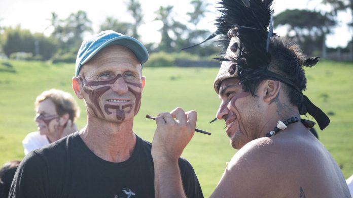 Una nueva jornada nos saca de la cama bien temprano, aún oscuro. Ya con un vehículo propio nos desplazamos con el grupo que nos acompaña otra vez hasta Tongariki, a unos veinte minutos de nuestro alojamiento. Tomamos posición, está un poco fresco, pero cuando los rayos del sol comienzan a iluminar la superficie y se filtran por entre los quince moais, todo a nuestro alrededor se enciende. Enésima poción de la magia Rapa Nui que fluye en un increíble amanecer. Tras retornar y desayunar en nuestro hotel, nos movilizamos hasta Tahai y nos sentamos en una especie de semicírculo. Como surgidas de la nada, unas quince personas, todos indudablemente con sangre polinésica, comienzan a deleitarnos con danzas locales. Nosotros sentados, ellos bailando, los cinco moais de Tahai y de fondo el Pacífico rompiendo contra la costa. Bailan y cantan, moviéndose con gracia y naturalidad, hasta que una canción paraliza el ambiente. Una nativa, se posiciona en el centro y todo el resto se ubica detrás de ella en forma de medialuna. Entona una canción lenta que parece envolvernos mientras sus compañeros bambolean sus cuerpos suavemente de izquierda a derecha. Miro a mi alrededor; cada espectador está inmóvil, embelesado, y más de uno con sus ojos vidriosos, entre los que me incluyo. Un cambio de ritmo rompe el hechizo y nos invitan a bailar, pintan nuestras caras y de repente nos convertimos en guerreros Rapa Nui.