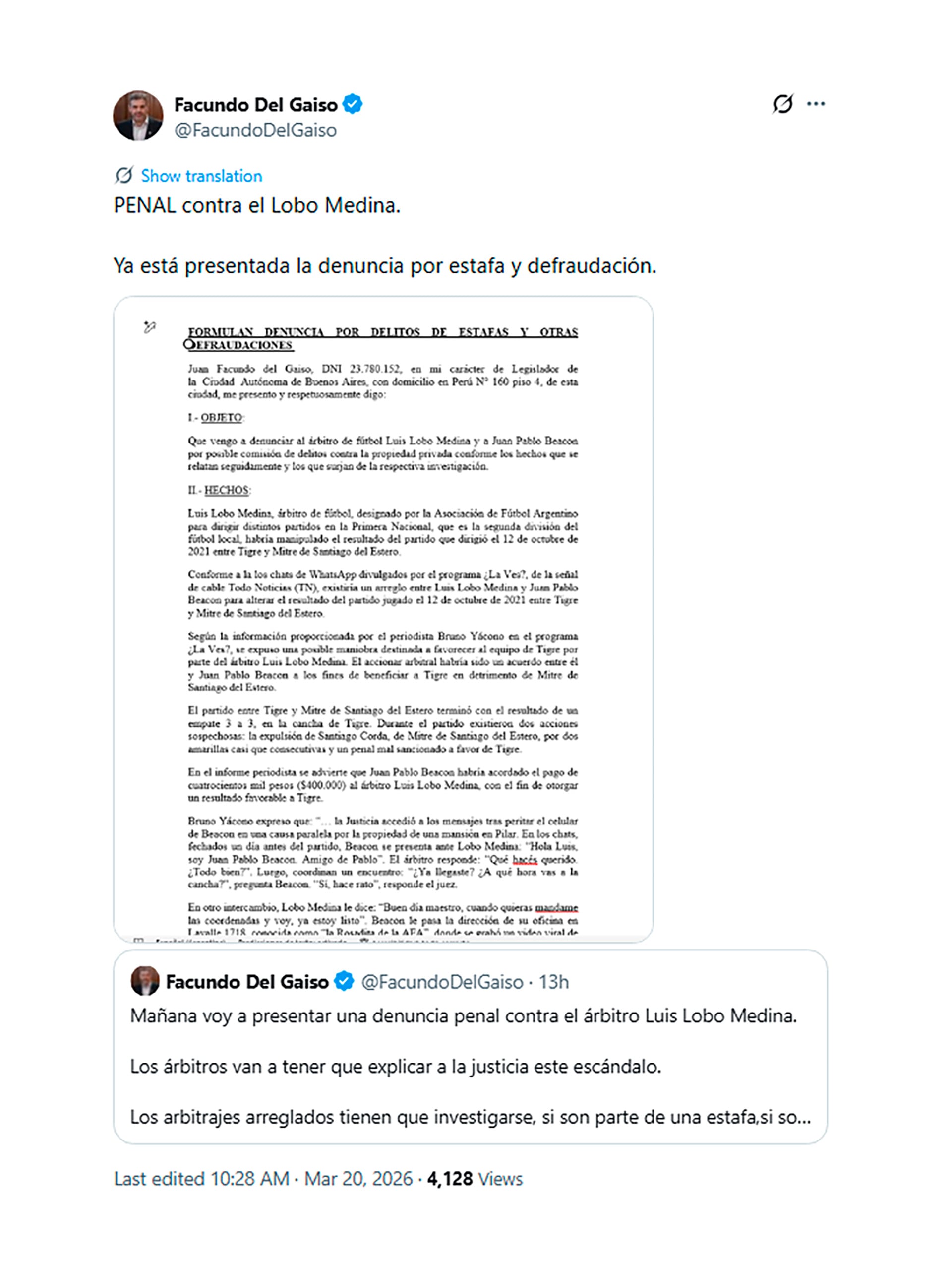 La presentación ante la Justicia, que difundió el propio del Gaiso en sus redes sociales, ponen bajo investigación al árbitro Lobo Medina y a Juan Pablo Beacon, ex asesor del Consejo Federal de la AFA.