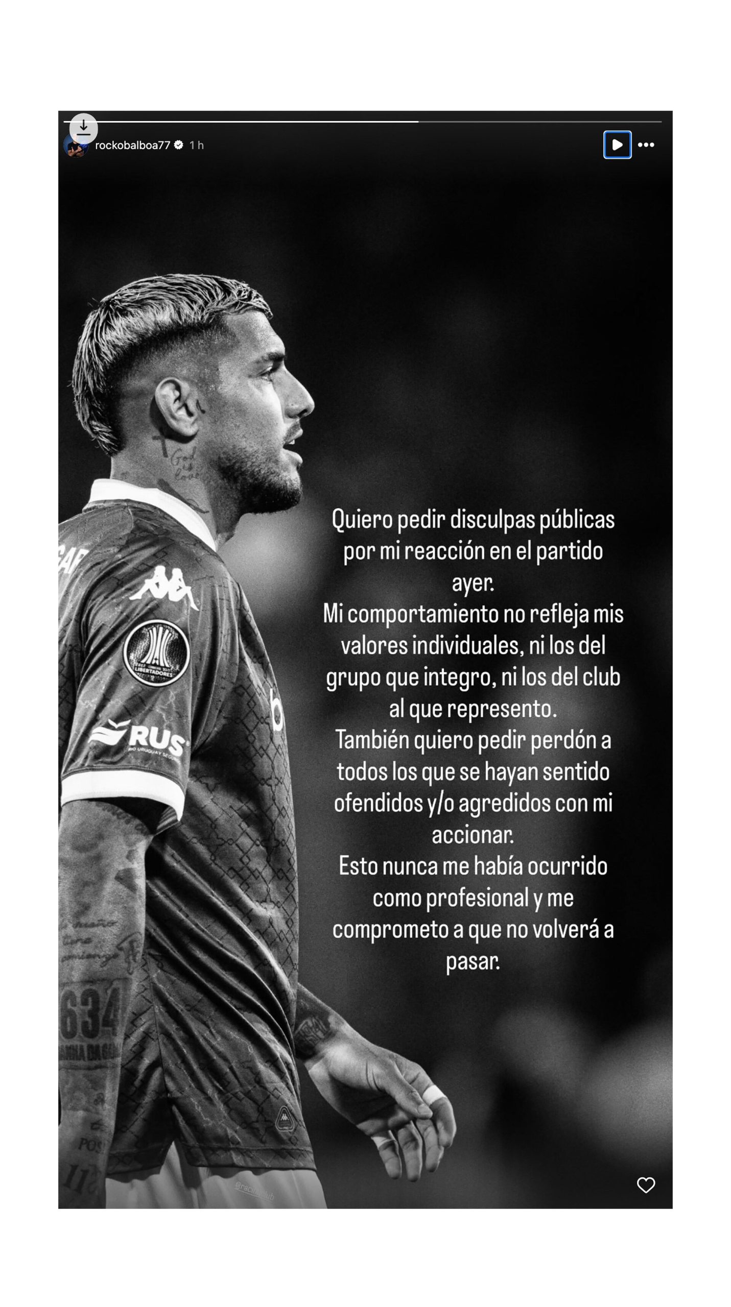En el comunicado difundido a través de sus redes sociales, que reabrió tras haberlas cerrado temporalmente, Balboa expresó: “Quiero pedir disculpas públicas por mi reacción en el partido ayer. También quiero pedir perdón a todos los que se hayan sentido ofendidos y/o agredidos con mi accionar. Esto nunca me había ocurrido como profesional y me comprometo a que no volverá a pasar”.