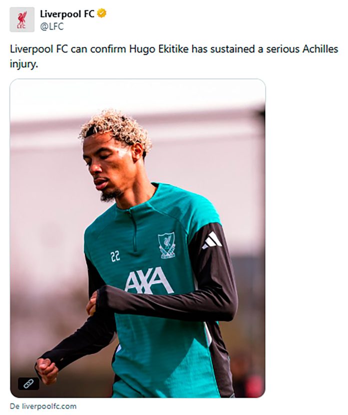 La noche del incidente, en el minuto 28 de un duelo decisivo para las aspiraciones europeas del Liverpool, Ekitike cayó al césped y se sujetó el tobillo derecho mientras intentaba ponerse de pie, pero sus esfuerzos resultaron infructuosos. Las imágenes del momento muestran al delantero saliendo entre lágrimas, acompañado por el equipo médico. De acuerdo con el comunicado oficial emitido por el club, las pruebas realizadas al día siguiente confirmaron el alcance de la lesión: “Daremos más actualizaciones a su debido tiempo, con Hugo recibiendo todo el apoyo del Liverpool”, remarcó la institución inglesa.