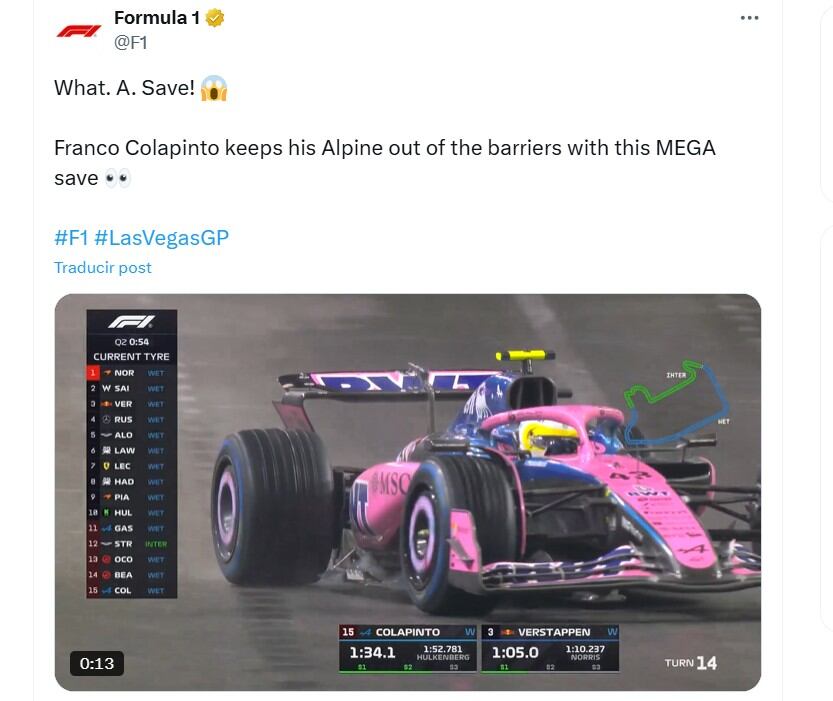 La cuenta oficial de la Fórmula 1 elogió la maniobra de Colapinto con el video adjunto: “¡Qué salvada! Franco Colapinto mantiene su Alpine fuera de las barreras con esta MEGA salvada».