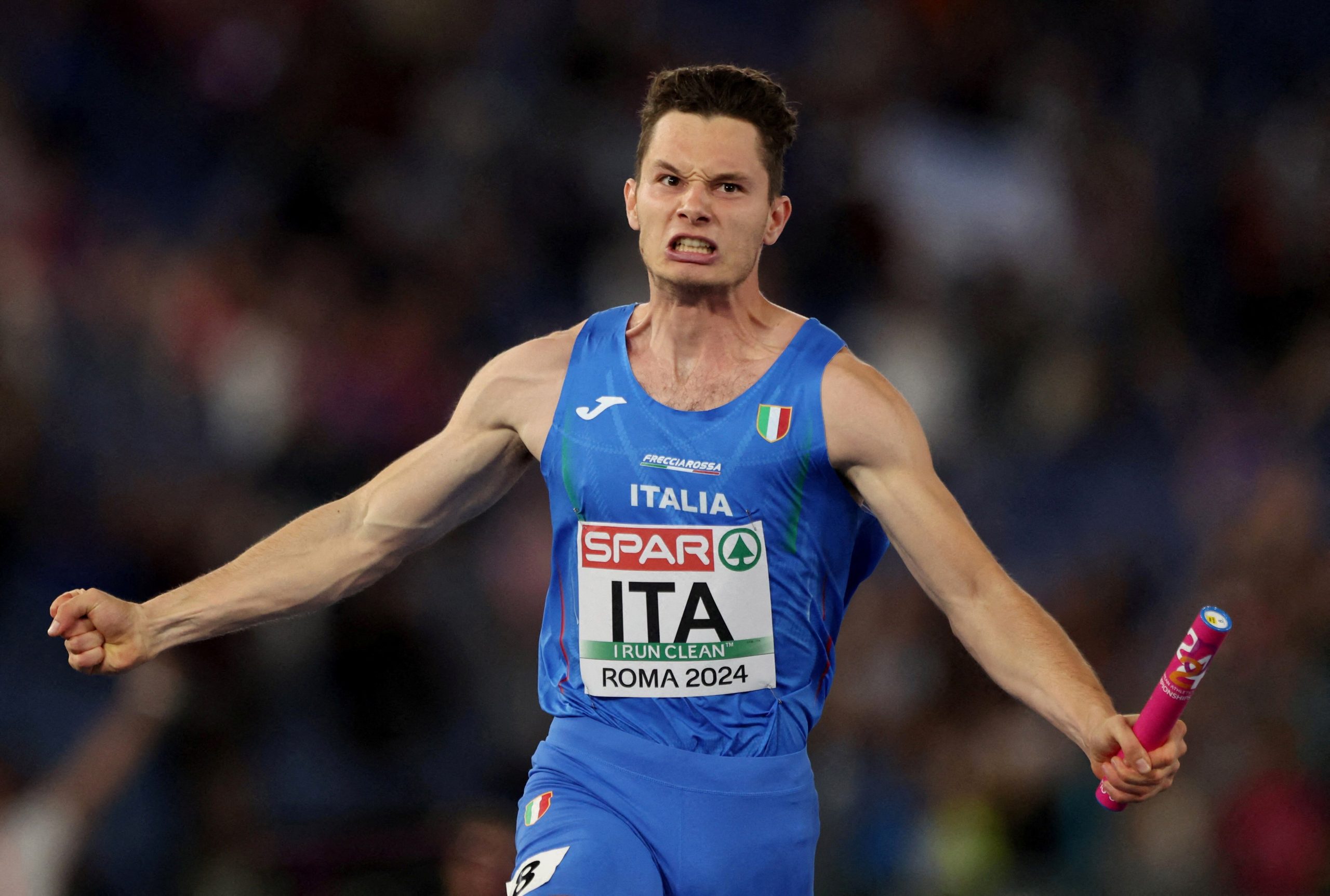 El atleta italiano Filippo Tortu durante el campeonato Europeo de Atletismo en Roma durante la prueba de relevos 4x100 (REUTERS/Manon Cruz)