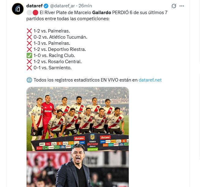 Con este resultado, River acumula cuatro caídas consecutivas en el certamen local y suma cinco derrotas en los últimos seis partidos, lo que generó un fuerte malestar entre los hinchas, quienes despidieron al equipo con silbidos y cánticos de protesta. El equipo dirigido por Marcelo Gallardo mostró dificultades para generar peligro y no logró revertir la imagen durante el segundo tiempo, mientras que Sarmiento, bajo la conducción de Facundo Sava, defendió la ventaja sin sobresaltos.