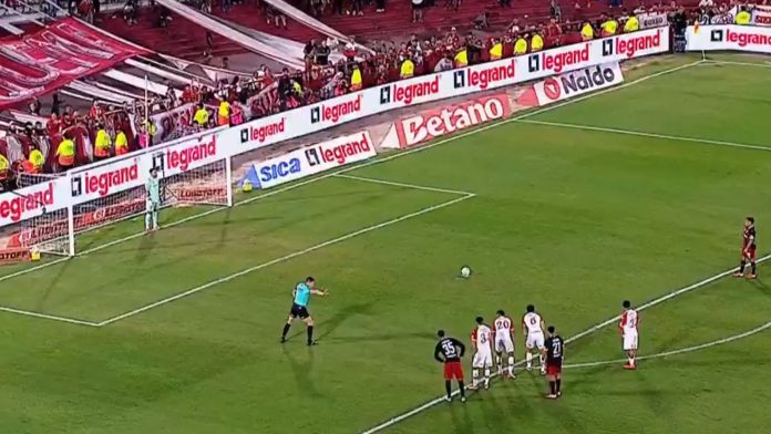 Sin haber tocado ningún balón previo, el número 10 de River fue directo hacia el punto penal para intentar poner el 2-1 y devolverle la ventaja a su equipo. Juanfer tomó unos pasos de carrera, miró hacia el palo izquierdo de Hernán Galíndez y remató. Sin embargo, el arquero de la selección ecuatoriano le adivinó la intención y le tapó el disparo. En el rebote, Quintero intentó definir de cabeza, pero lo hizo de manera defectuosa, por lo que el guardameta le volvió a negar el gol.