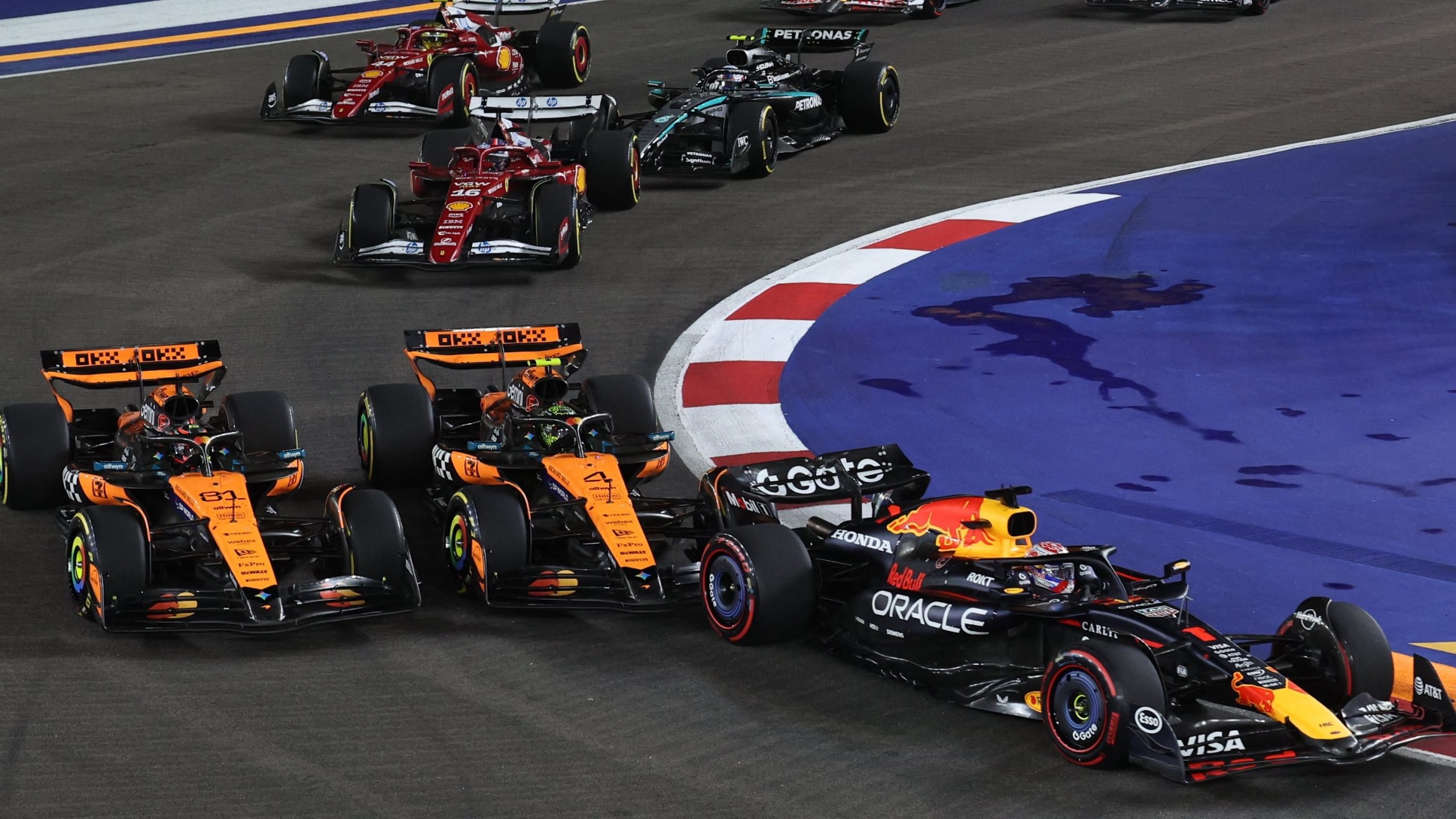 La maniobra se produjo en condiciones de pista complicadas, con zonas húmedas tras la lluvia y una salida que se preveía decisiva por la dificultad para adelantar en Singapur. Norris, que partía desde el lado derecho de la parrilla, tuvo una reacción destacada y superó de inmediato a Kimi Antonelli, quien, al igual que Max Verstappen, perdió tracción al soltar el embrague. En la curva 1, el joven británico se mostró especialmente decidido frente a su compañero, optando por el piano interior para emparejarse con el australiano. Esta acción le hizo perder tracción, permitiendo que Piastri saliera medio coche por delante, aunque debió modificar su trayectoria para evitar el contacto, lo que afectó su aceleración hacia la curva 2. Al llegar al vértice, ambos McLaren se encontraron lado a lado, con Norris en la línea interna para la curva 3.
