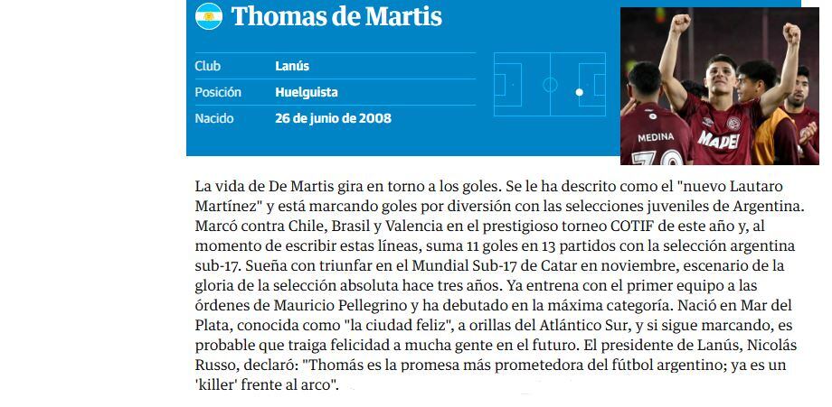 Thomás de Martis, oriundo de Mar del Plata, fue calificado por el presidente de Lanús, Nicolás Russo, como “el prospecto más emocionante del fútbol argentino” y un “killer” (asesino) frente al arco. Este año marcó goles ante Chile, Brasil y Valencia en el torneo COTIF, torneo internacional juvenil disputado en España, alcanzando 11 anotaciones en 13 partidos con la selección argentina Sub 17. “El nuevo Lautaro Martínez”, como lo describen, se entrena con el primer equipo dirigido por Mauricio Pellegrino y ya debutó en la máxima categoría. El atacante persigue el objetivo de participar en el Mundial Sub 17 de Qatar en noviembre, mismo escenario donde la selección mayor se consagró tres temporadas antes.