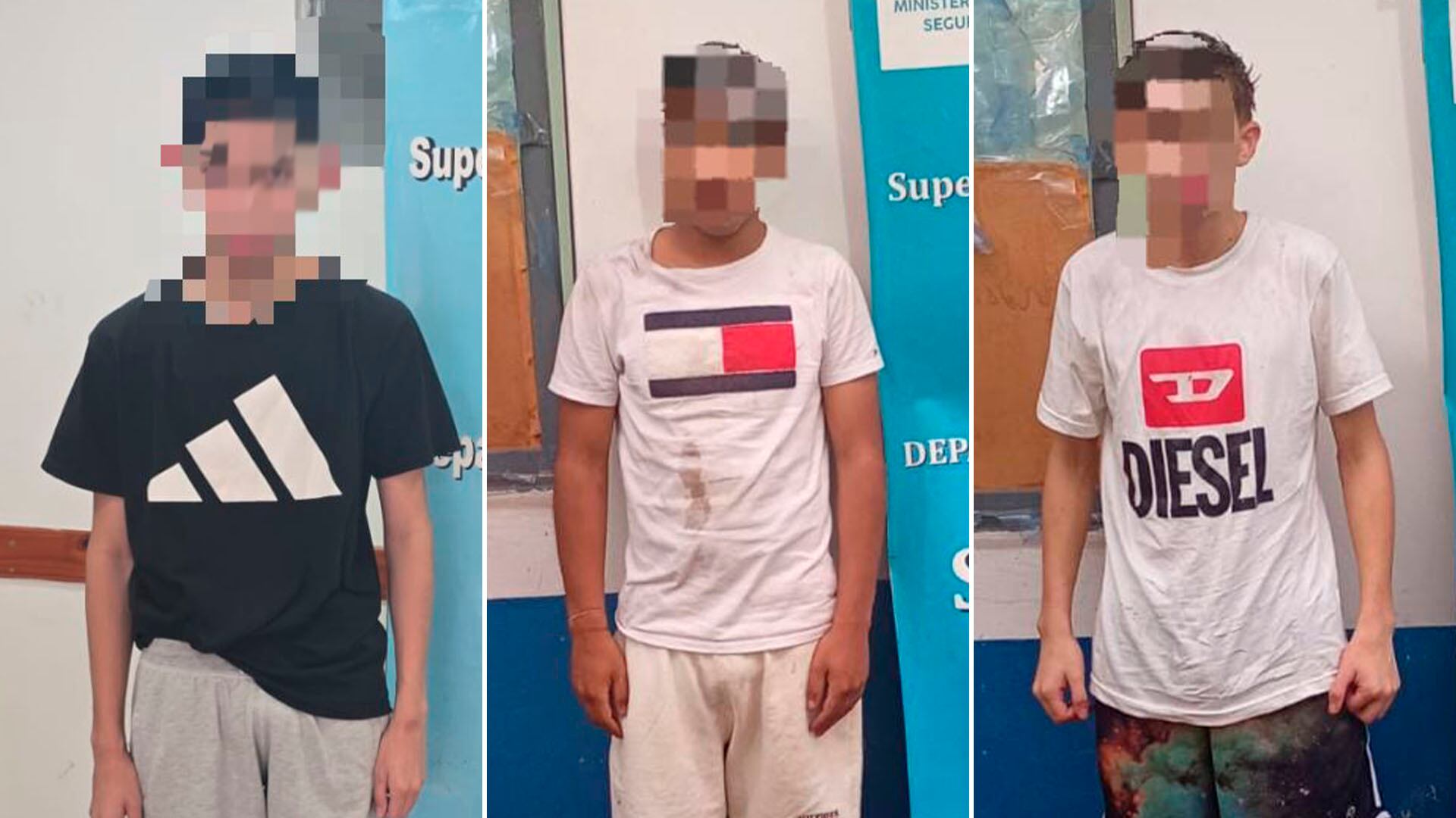 Se muestra a tres jóvenes, con rostros pixelados, tras ser detenidos como presuntos integrantes de
