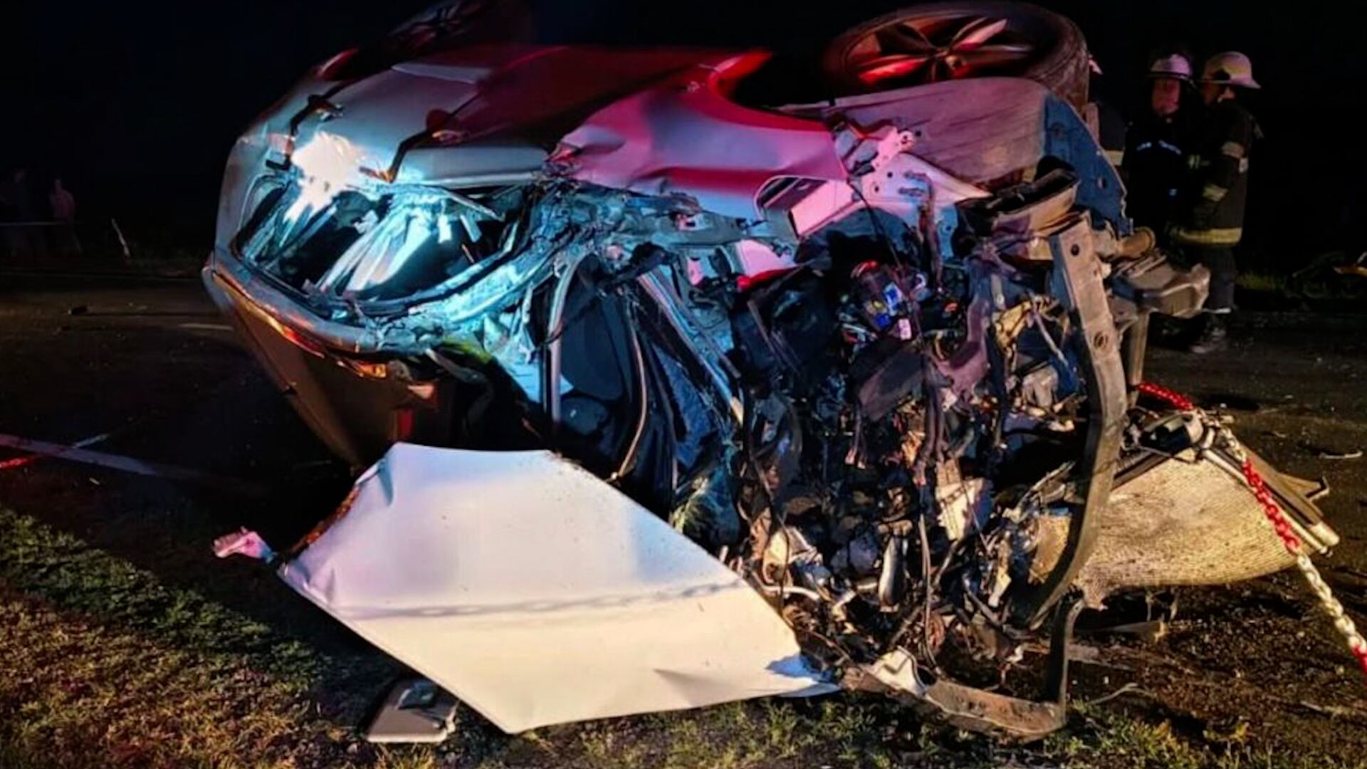 Servicios de emergencia, incluyendo camiones de bomberos y ambulancias, asisten en el lugar de un accidente vial durante la noche, con la policía asegurando la zona.