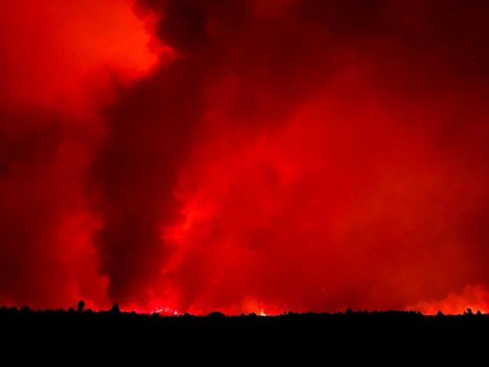 El fuego avanza sin control. La combinación de una sequía histórica y vientos erráticos ha generado un escenario de incertidumbre total para los pobladores, quienes describen un panorama dantesco donde el fuego parece devorarlo todo a su paso. Durante la noche del domingo y la madrugada de este lunes, los pobladores registraron en fotos imágenes inéditas, con el cielo enrojecido por el avance descontrolado del fuego.
