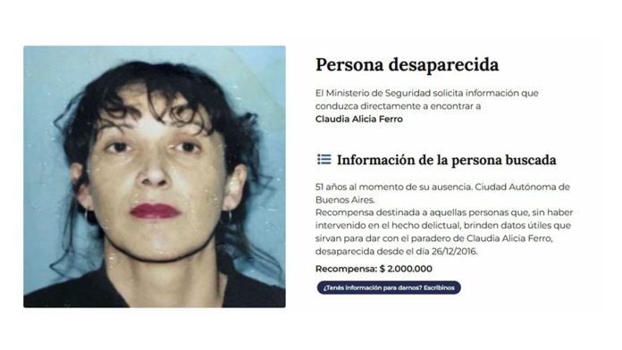 El Ministerio de Seguridad de la Nación ofrece la magra recompensa de $2 millones para quien aporte datos sobre Claudia, a la que consideran víctima de “un hecho delictual”.