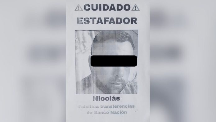 El cartel de advertencia con la foto de un hombre identificado como el estafador en Los Hornos (Foto: Policía bonaerense)