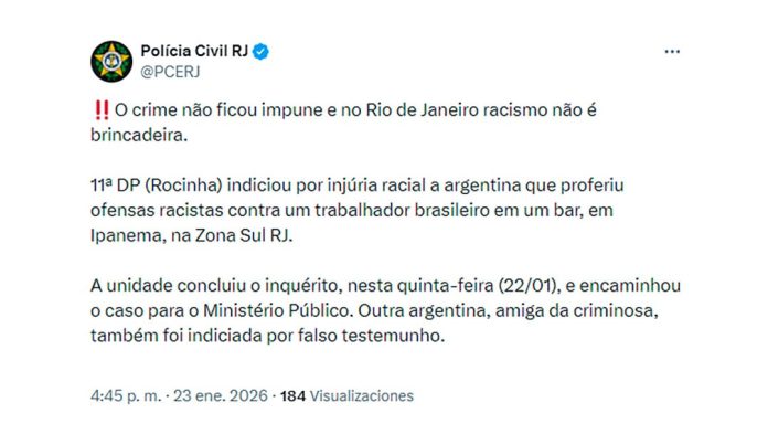 “El crimen no quedó impune y en Río de Janeiro el racismo no es una broma”, fue el mensaje que publicó la Policía Civil en sus canales oficiales al comunicar el cierre de la investigación y el avance de la causa judicial.