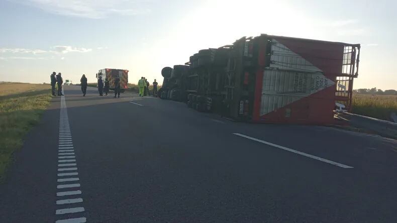 Por motivos que permanecen bajo investigación judicial, el conductor perdió el control, el camión despistó y volcó, quedando atravesado parcialmente sobre la cinta asfáltica y la banquina.