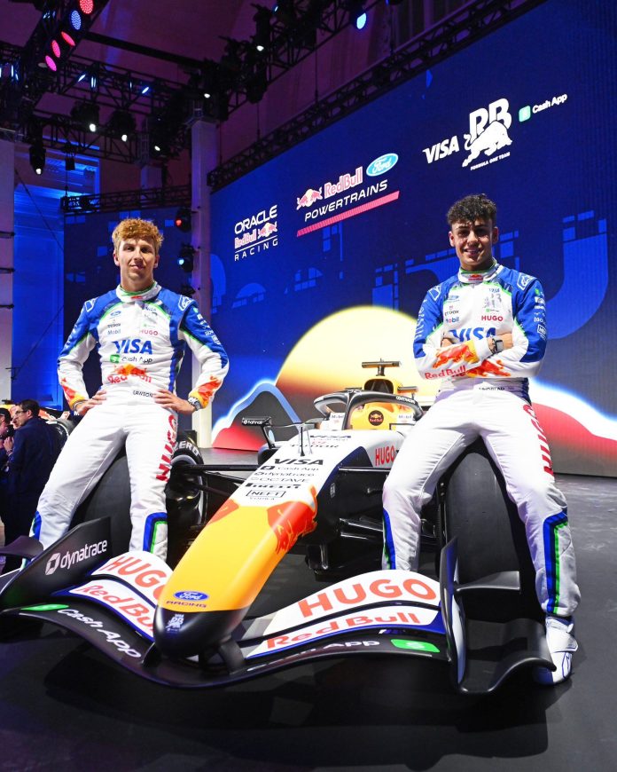 Liam Lawson y Arvid Lindblad durante la presentación del diseño del Racing Bulls para el 2026 (Foto: @visacashapprb)