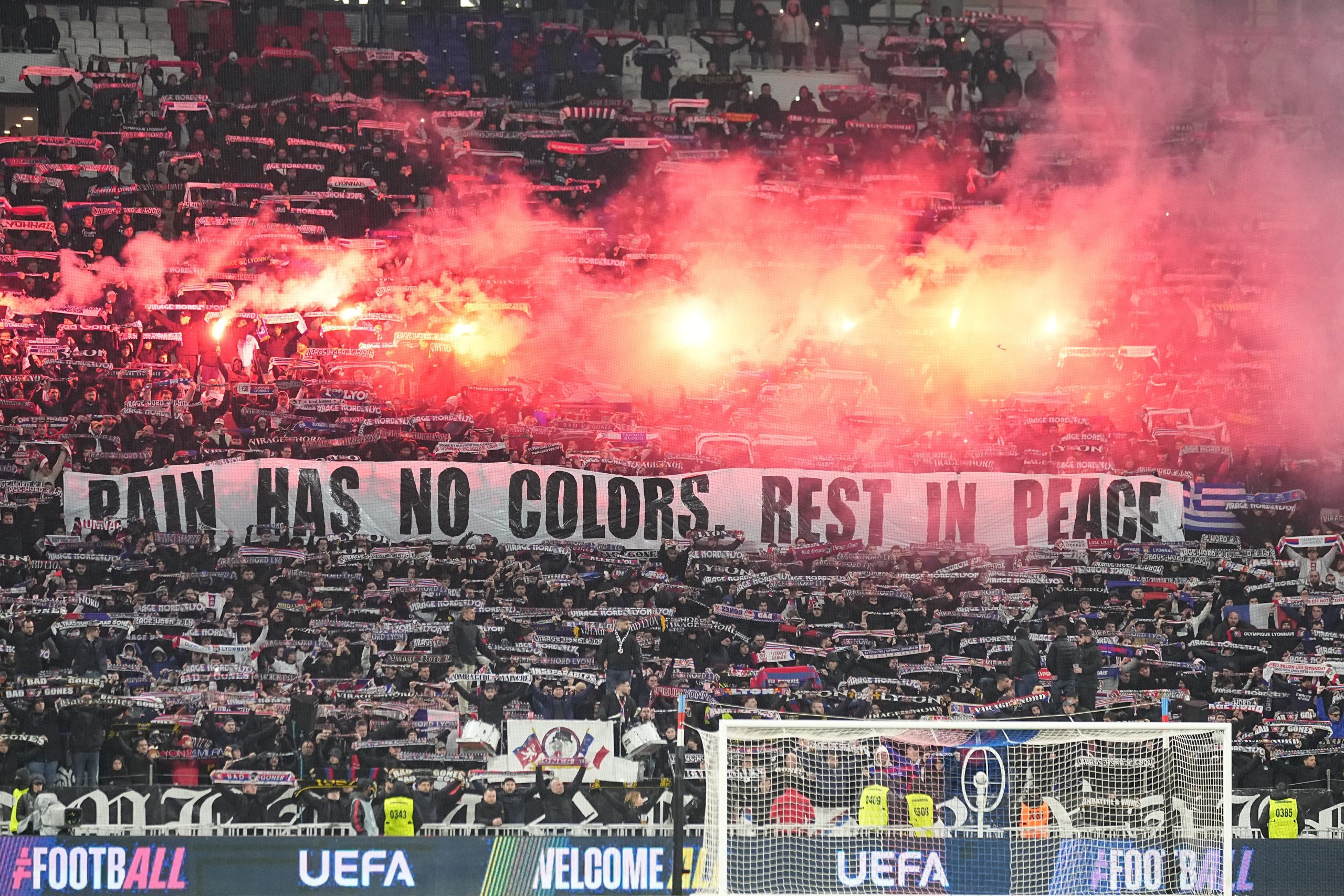 Ambos equipos se presentaron en el terreno de juego con un brazalete negro. “El dolor no tiene color, descansen en paz”, señaló una bandera que desplegaron los hinchas del Lyon. Además, los jugadores del PAOK posaron con una camiseta en honor a las siete personas que perdieron la vida. Al mismo tiempo, como lo indicó la UEFA previamente, hubo un emotivo minuto de silencio que fue respetado por todo el estadio. Incluso, los aficionados locales prendieron siete bengalas y levantaron sus bufandas características en su honor.