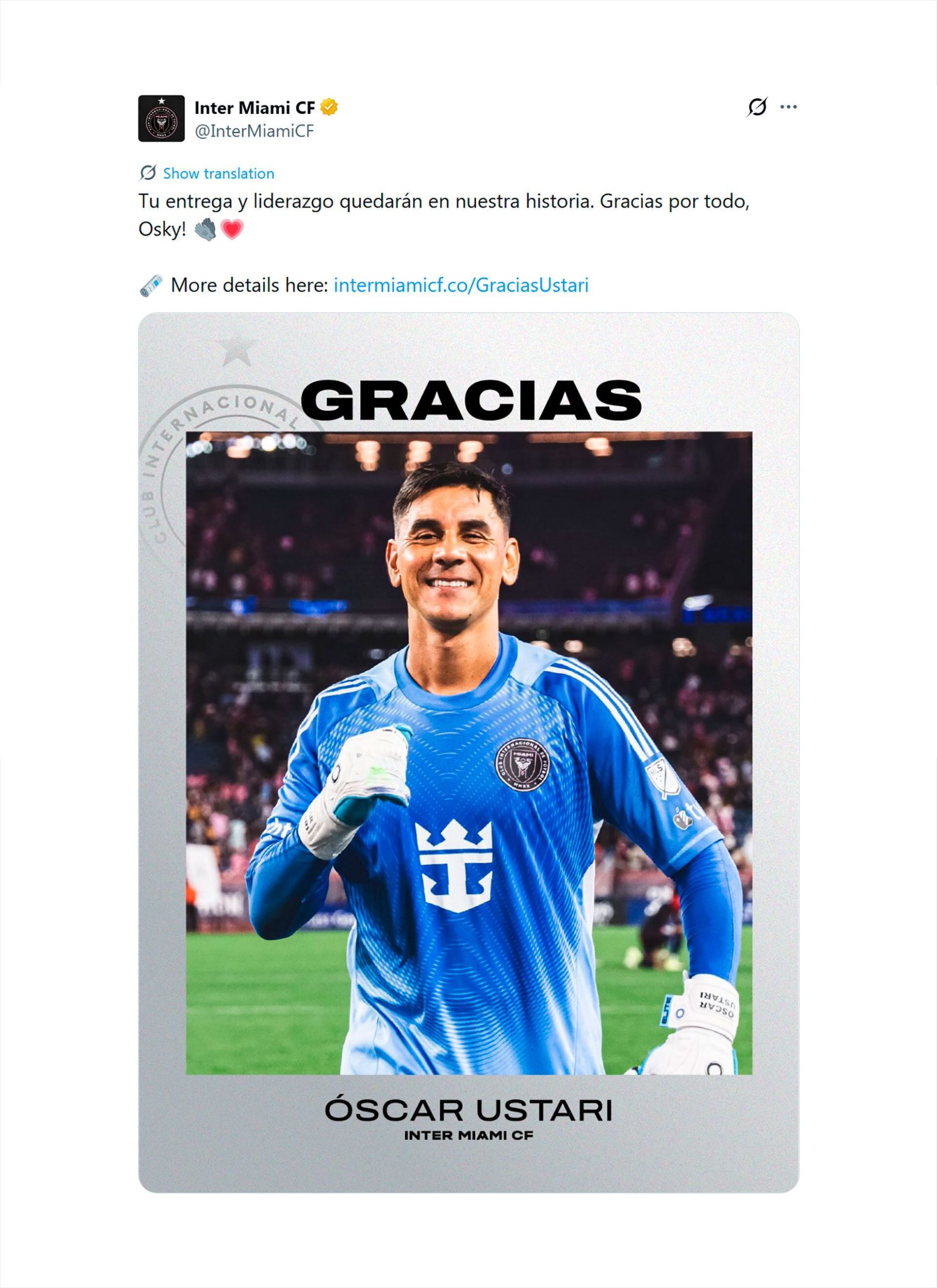 Tu entrega y liderazgo quedarán en nuestra historia. ¡Gracias por todo, Osky!”, fue la frase que agregó el Inter Miami en la publicación en redes con la que despidió al arquero surgido en Independiente de Avellaneda. En otro posteo, Las Garzas publicaron un video con los momentos más importantes de Ustari en el club y sus mejores intervenciones. “Atajadas, carácter y corazón. Dejaste tu huella en Miami, Óscar”, fue el mensaje que acompañó a los recortes.