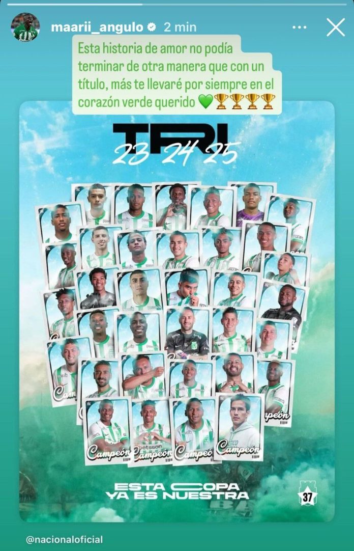 Un rato antes, el delantero colombiano también había compartido una imagen en Instagram con la que insinuó que se está despidiendo de Atlético Nacional: “Esta historia de amor no podía terminar de otra manera que con un título, más te llevaré por siempre en el corazón, Verde querido”. En Colombia todo está encaminado para decir adiós al flamante campeón de copa nacional.
