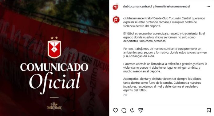 El conjunto tucumano también se expresó en sus canales oficiales para repudiar lo sucedido. “Desde Club Tucumán Central queremos expresar nuestro profundo rechazo a cualquier hecho de violencia dentro del deporte. El fútbol es encuentro, aprendizaje, respeto y crecimiento. Es el espacio donde nuestros chicos se forman no solo como deportistas, sino como personas”, expresó.