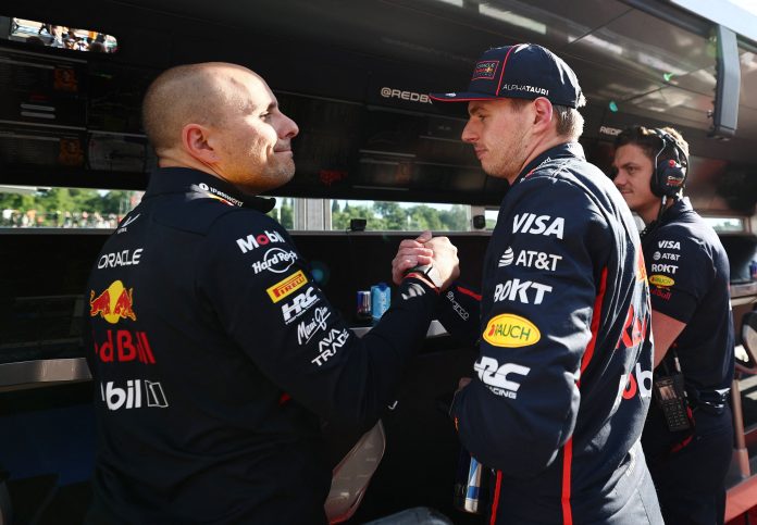 Gianpiero Lambiase, que acompaña a Verstappen desde su debut en 2015, está en constante comunicación con el neerlandés durante la carrera y lo ayuda con la puesta a punto del monoplaza (REUTERS/Ricardo Arduengo)