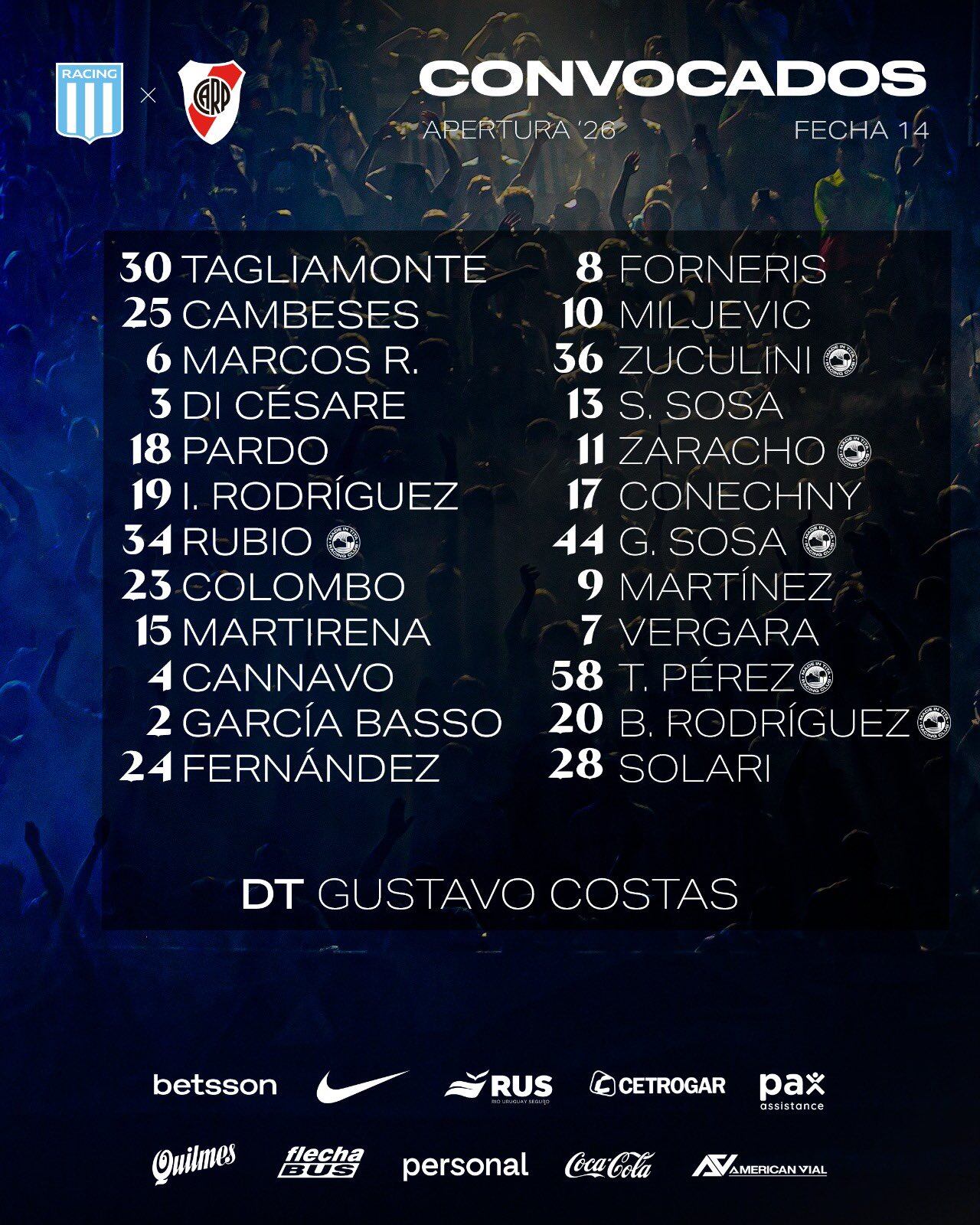 Los jugadores de Racing que recibirán a River (@RacingClub)La lista de jugadores de River que visitarán Avellaneda (qRiverPlate)
