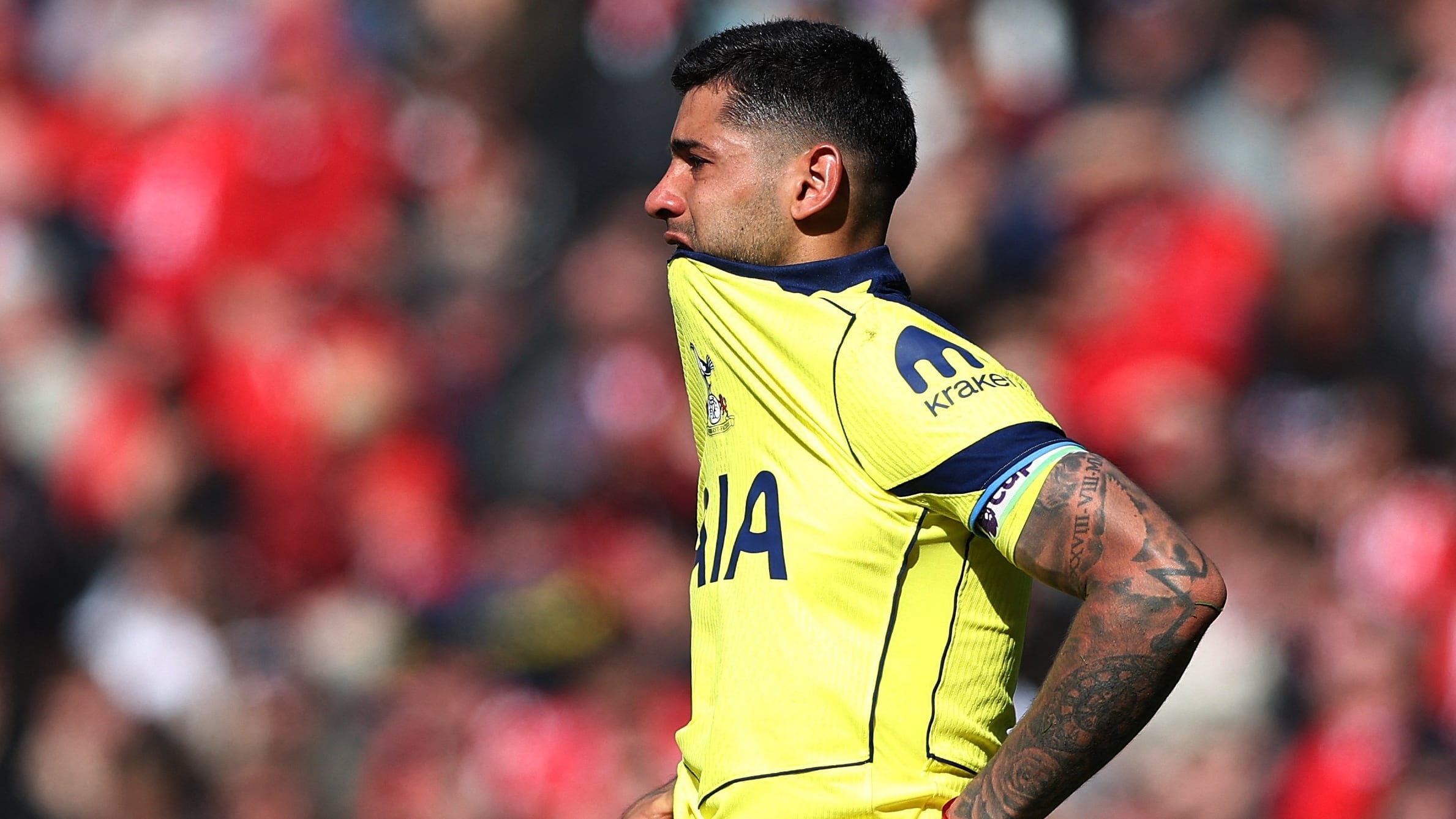 Cristian Romero con lágrimas tras sufrir la lesión (REUTERS/Scott Heppell)