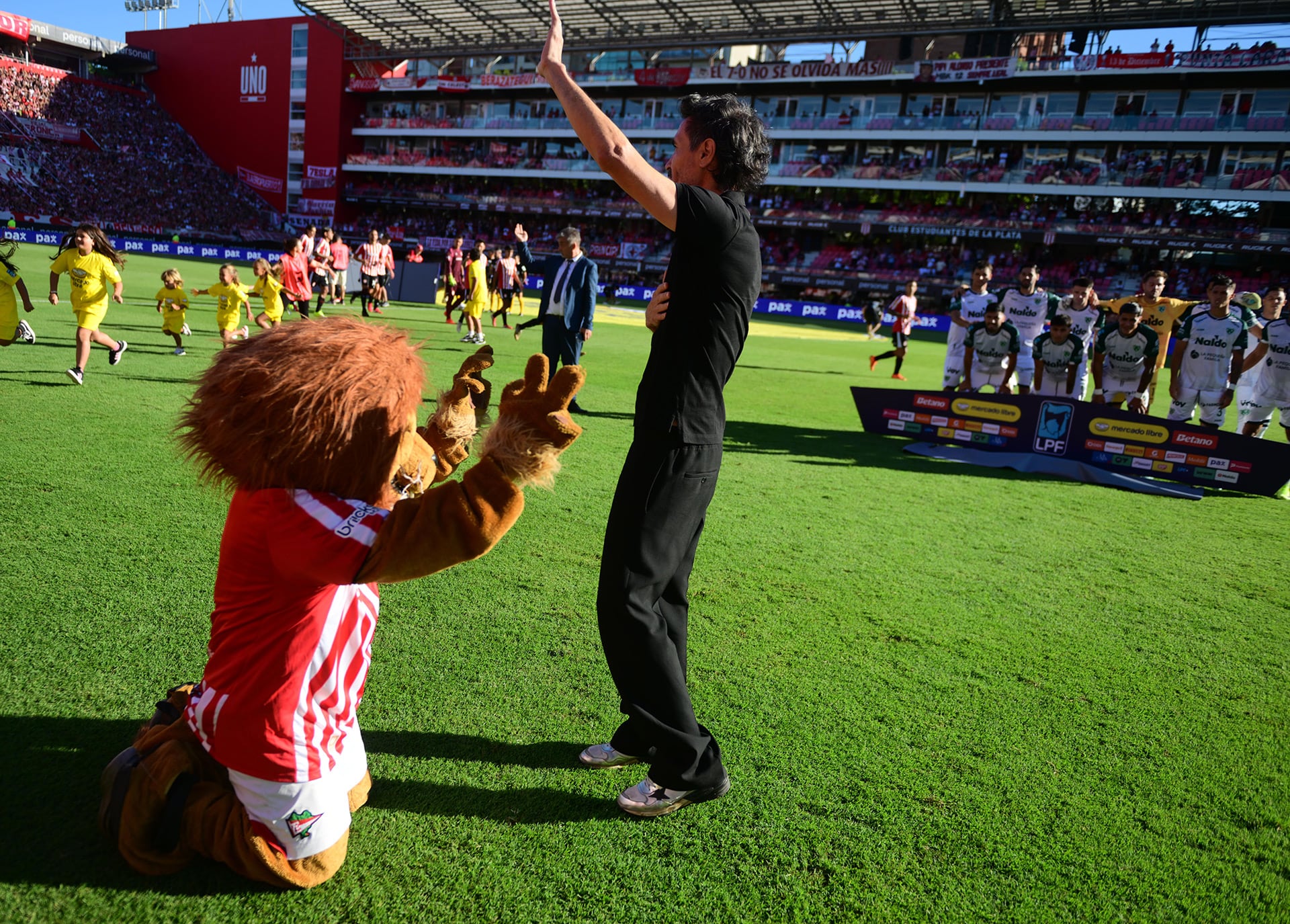 Eduardo Domínguez, director técnico de Estudiantes de La Plata, saluda a los aficionados ante la reverencia del León, la mascota del club (Fotobaires)